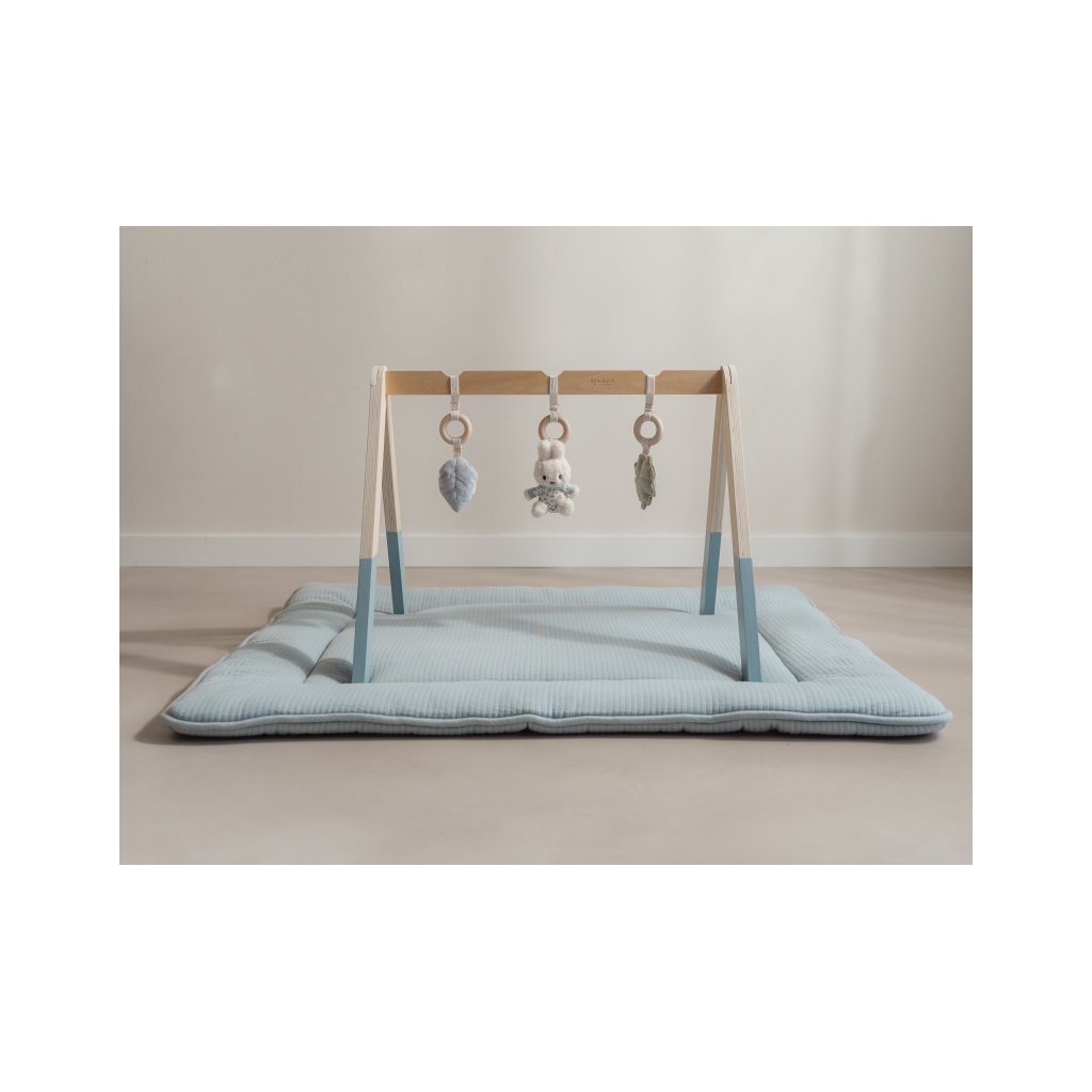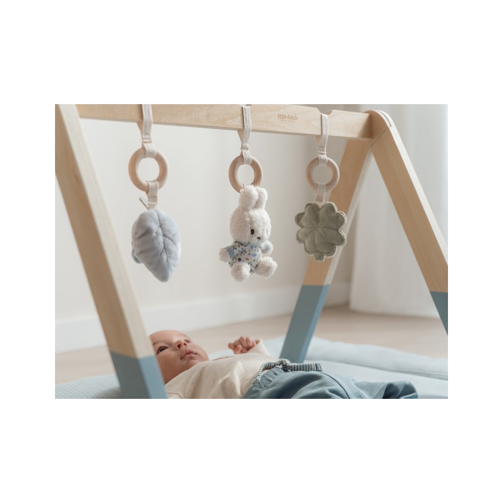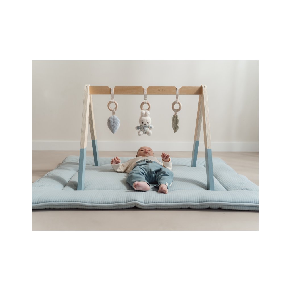 Stylová dřevěná hrazdička se třemi zavěšenými plyšovými hračkami v podobě ovečky, slunečnice a ptáčka poskytne vašemu miminku spoustu zábavy při hraní na dece. Jednotlivé hračky lákají dítě ke zkoumání a dotýkání, při pohybu chrastí a šustí.