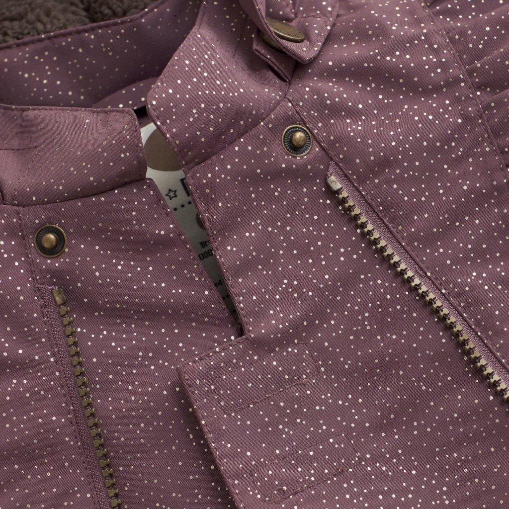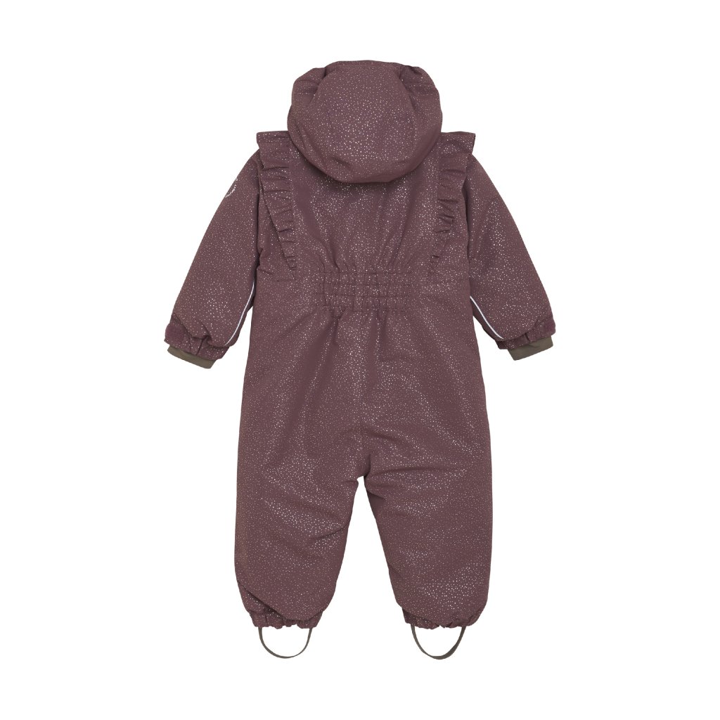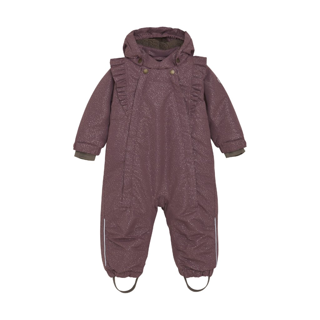 Hřejivá a odolná zimní kombinéza z kvalitního a pevného materiálu, která poskytuje maximální ochranu před chladem, deštěm i sněhem. Díky kombinaci vysoké voděodolnosti, prodyšnosti a odolnosti proti větru zaručí pohodlí a komfort při každodenním nošení i zimních hrách venku. Jemné volánky na ramenou a podél rukávů dodávají kombinéze elegantní a hravý vzhled.