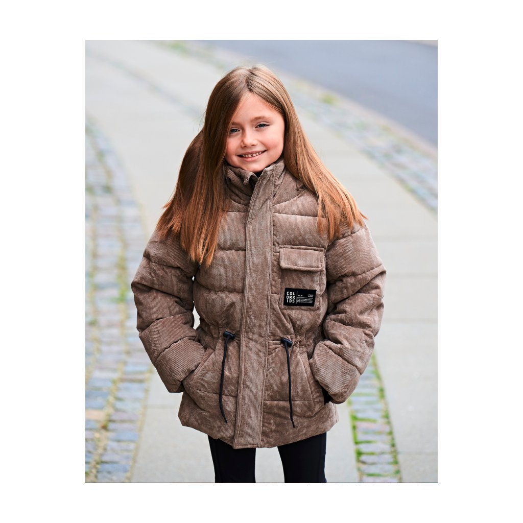 Krásná prošívaná bunda Color Kids z nepromokavého, hnědého manšestru s nášivkou s logem na levé straně hrudi.