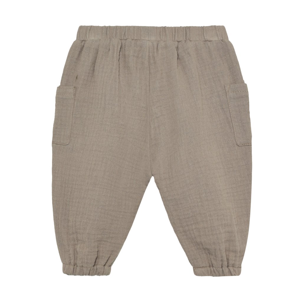 Jednoduché a pohodlné mušelínové kalhoty HUTTEliHUT pro miminka jsou ideální volbou na jarní a letní období. Díky elastickému pasu a elastickému zakončení nohavic kalhoty skvěle drží, neškrtí a přizpůsobí se pohybu dítěte – perfektní pro lezení, první krůčky i každodenní nošení.