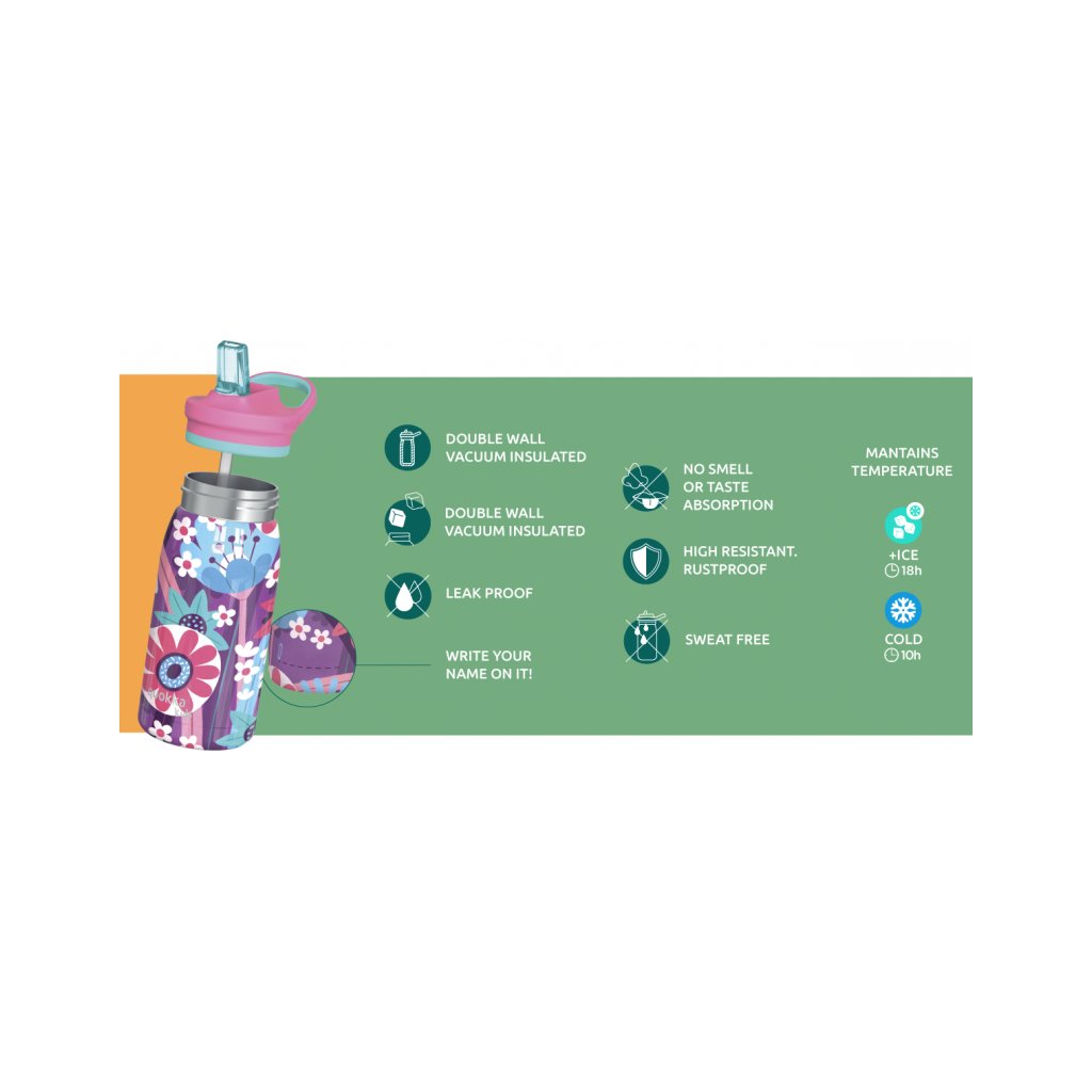 Dětská termoláhev Quokka Pop Kids z vysoce kvalitní dvoustěnné oceli udrží nápoj i během horkých letních dní příjemně studený. Láhev s pítkem a brčkem umožňuje snadné pití bez nutnosti naklánění láhve. Zaklapávací pítko brání vylití obsahu láhve. Široké hrdlo umožňuje vložení kostek ledu a zároveň se díky němu láhev snadno čistí. Údržbu usnadňuje i odnímatelné široké brčko. Díky držadlu se láhev snadno přenáší.