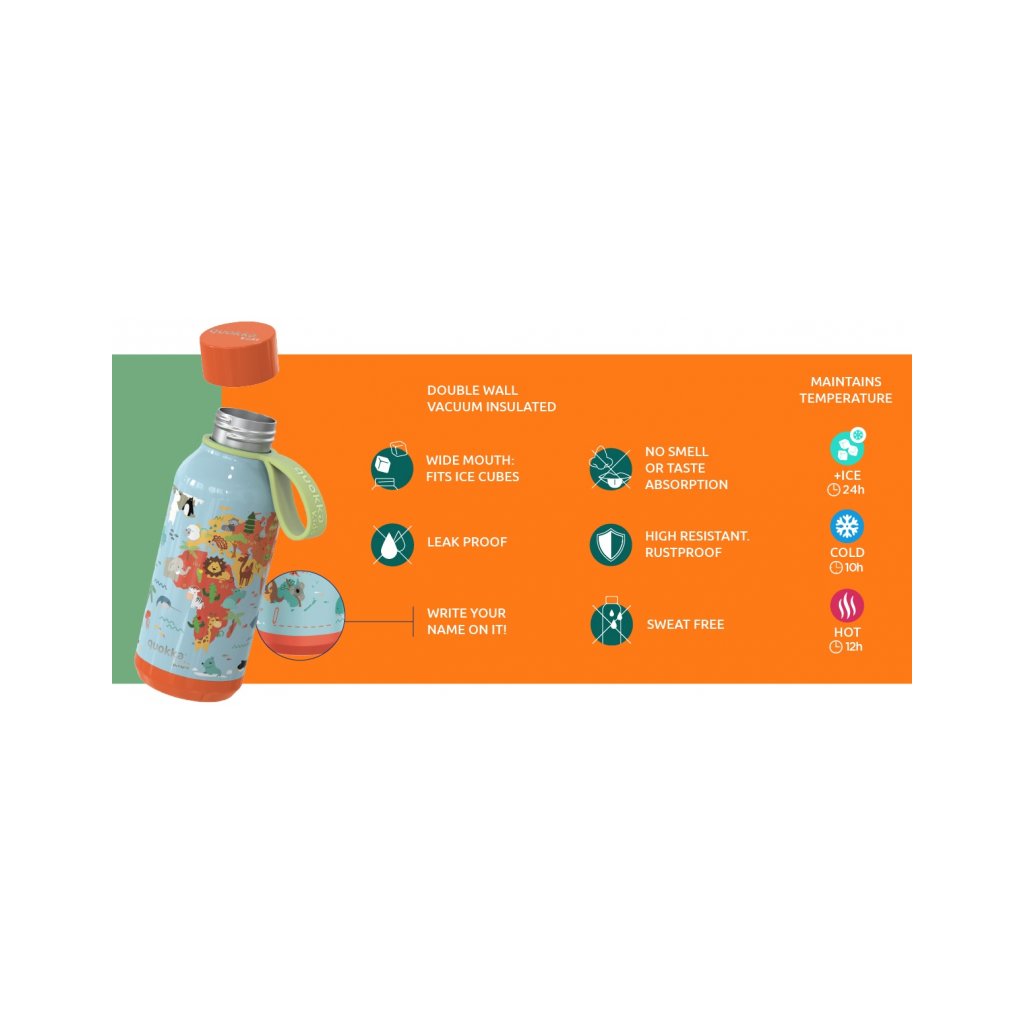 Termoláhev je vybavena poutkem pro snadné přenášení. Na spodní části láhve je prostor pro napsání jména nebo nakreslení obrázku, aby nedošlo k záměně ve školce či ve škole.