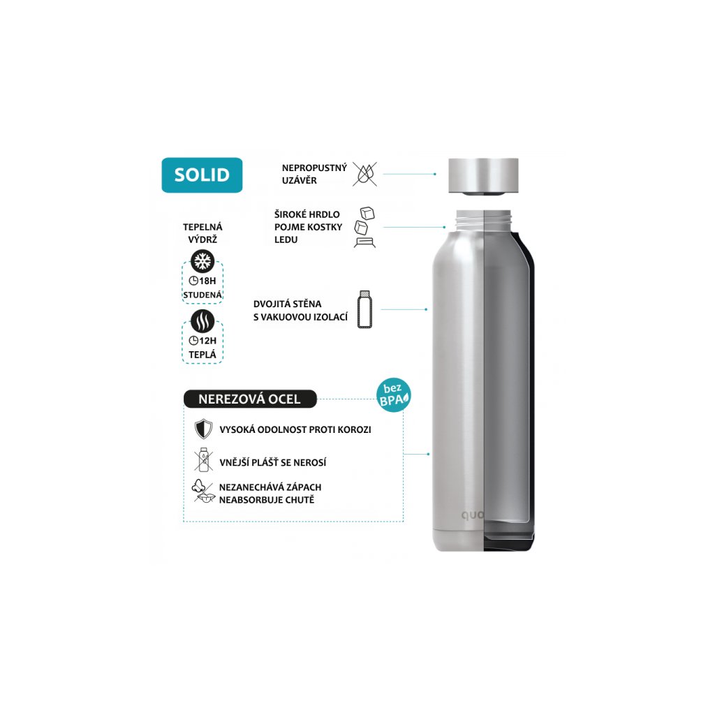 Termoska Quokka Solid z vysoce kvalitní dvoustěnné oceli se spolehlivým, 100% těsnicím uzávěrem udrží váš nápoj dle potřeby teplý či studený. Široké hrdlo umožňuje vložení kostek ledu. Termoska udrží teplotu studeného nápoje s ledem až 48 hodin, studeného nápoje až 18 hodin a teplého nápoje až 12 hodin.