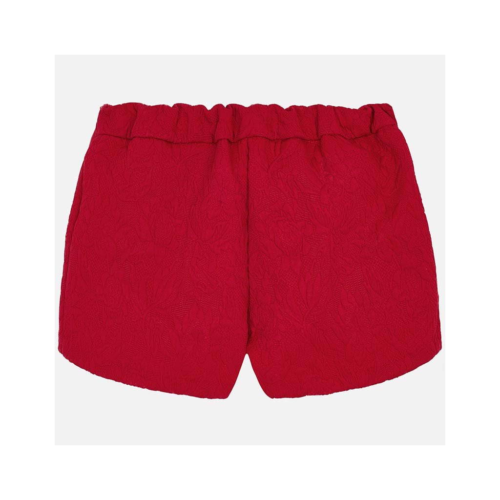 Dievčenské šortky pre dievčatko s nastaviteľným elastickým pásom. Dievčenské kraťasy sú vyrobené z čipky tkanej látky so vzorom a reliéfnymi motívmi. Kraťasy majú skladaný dizajn.