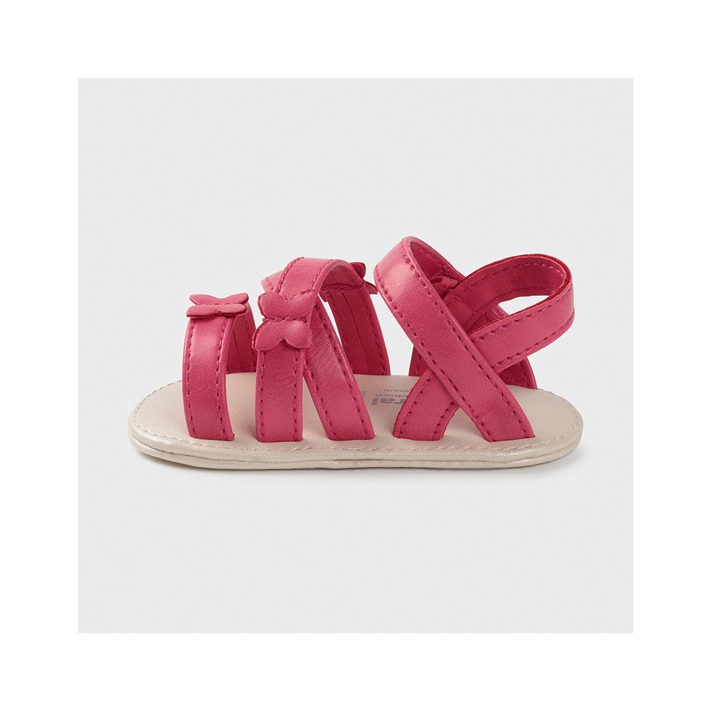 Mayoral dievčenské novorodenecké sandálky. Pohodlná mäkká podrážka pre topánky s veľkou priľnavosťou. Nastaviteľné zapínanie na suchý zips pre rýchle a jednoduché obutie. Zdobené drobnými motýlikmi.