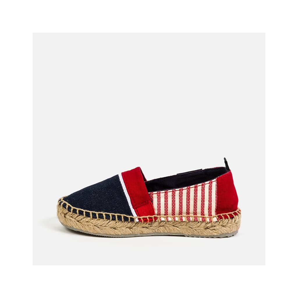 Espadrilové sandále pre chlapcov, ktoré dokonale dotvoria zábavný ležérny outfit. Topánky s vnútornou podšívkou a priedušnou bavlnenou stielkou. Vonkajší textilný materiál. Podrážka so zmesou spletenej trávy esparto a protišmykovej gumy. Malý remienok na päte, ktorý umožňuje rýchle a jednoduché obutie.