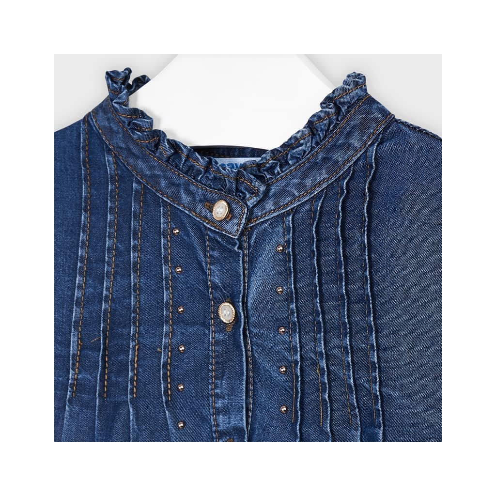 Mayoral originálna, nežná dievčenská blúzka s dlhým rukávom. Vzhľad džínsovej blúzky. Vyrobené z materiálu lyocell, druhu viskózových vlákien, veľmi ľahký, príjemný a pohodlný materiál. Blúza je zapínacia v prednej časti pomocou gombíkov. Na konci rukávov má pružné široké manžety, zakončené jemnými volánikmi. Tie sú aj vo výstrihu. Zdobená je kovovými prvkami.