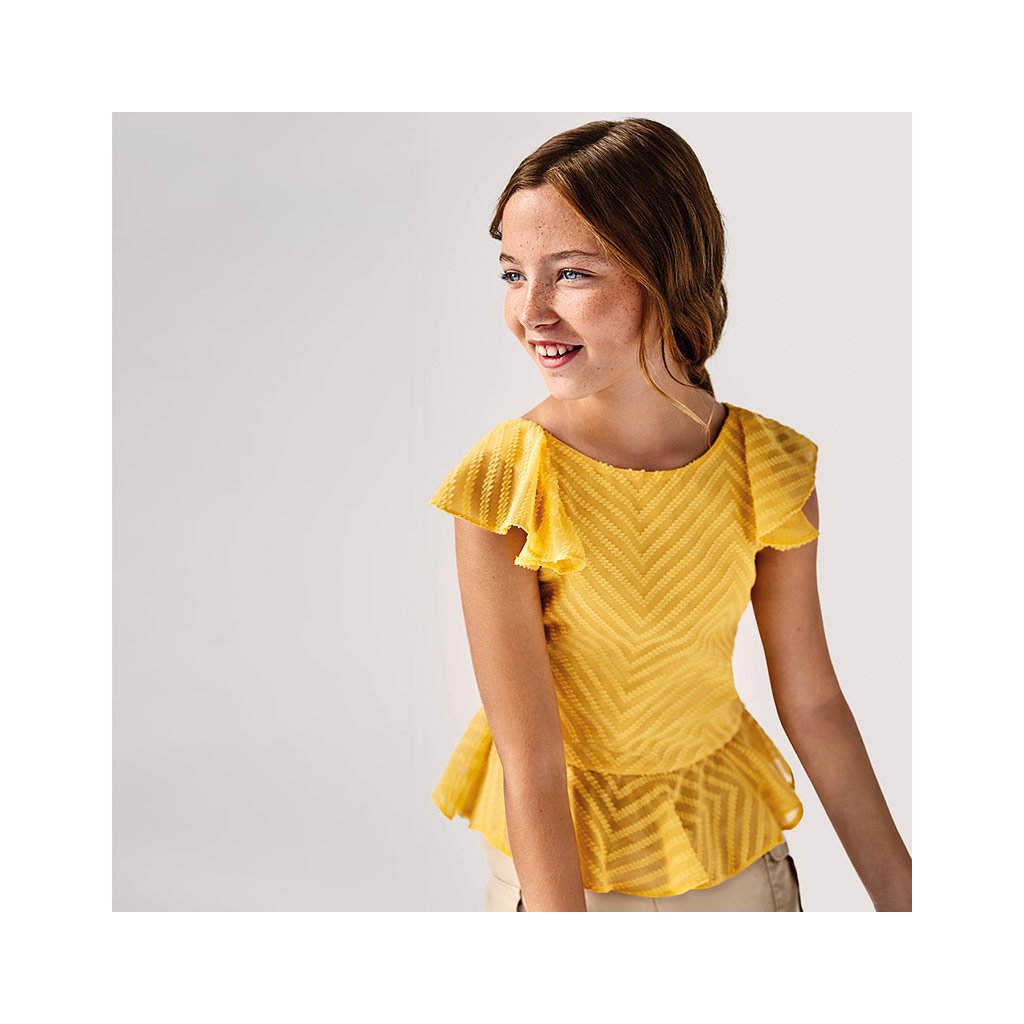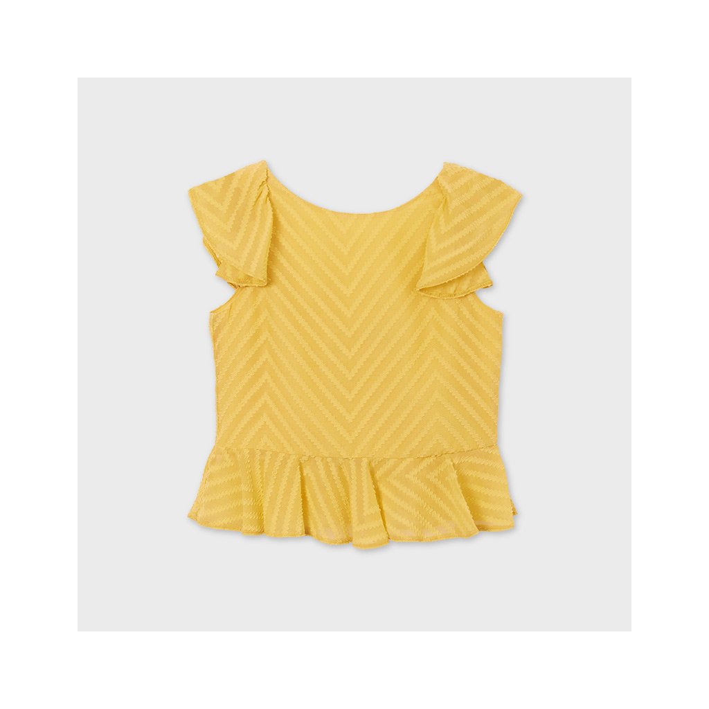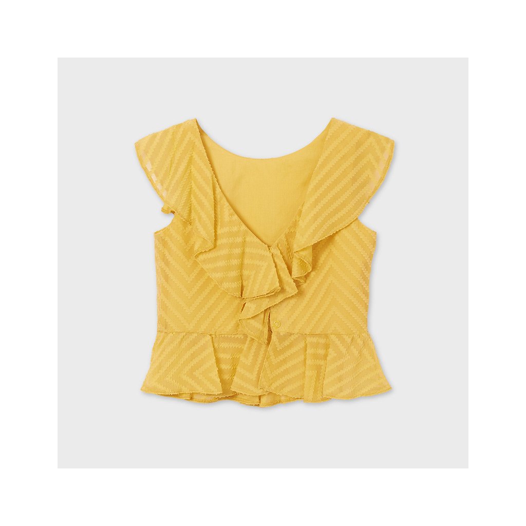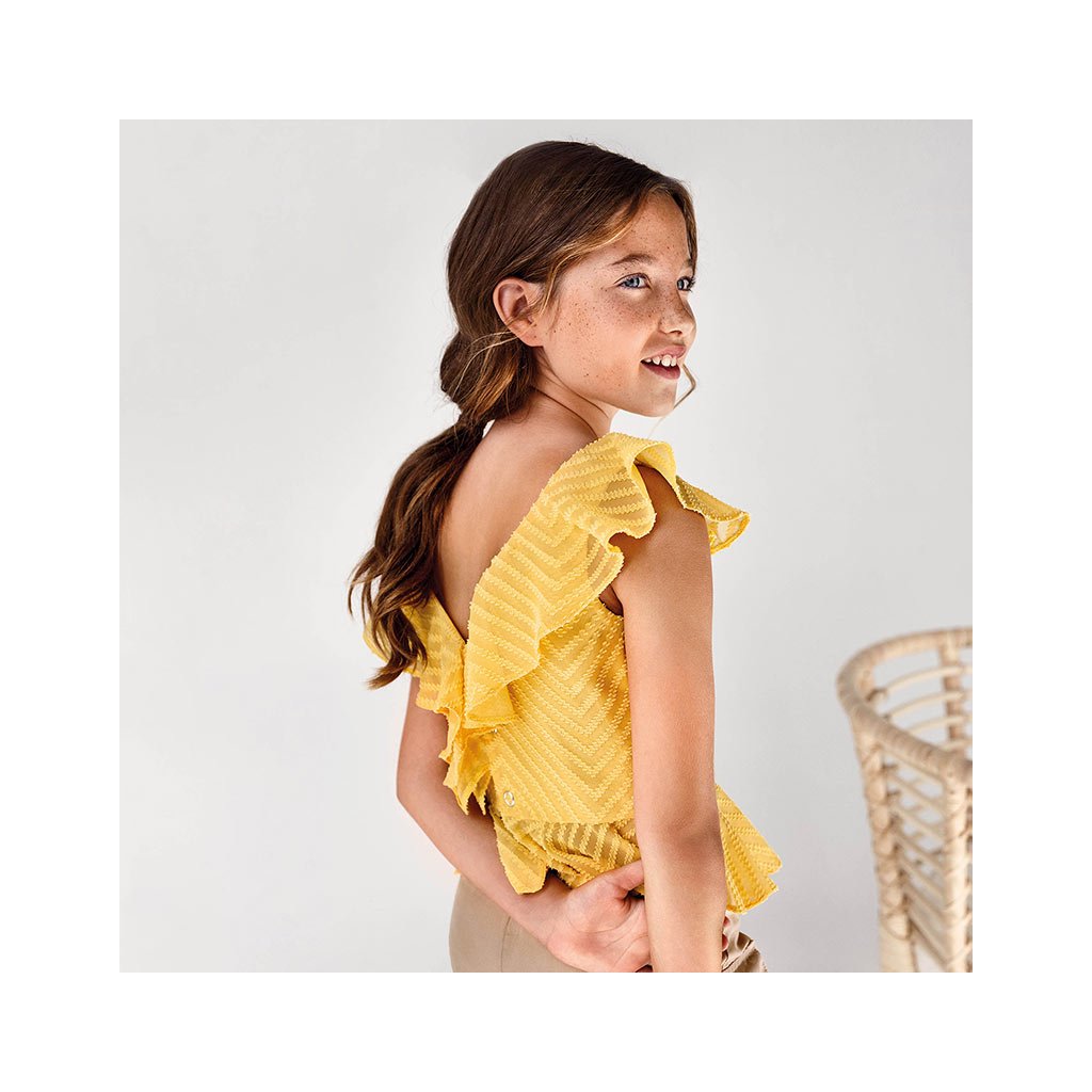 Mayoral úžasná dievčenská blúzka s volánikmi. Vyrobená zo vzdušného ľahkého materiálu. Zapínanie vzadu pomocou gombíkov. Zdobená volánikmi, na chrbte hlboký výstrih.