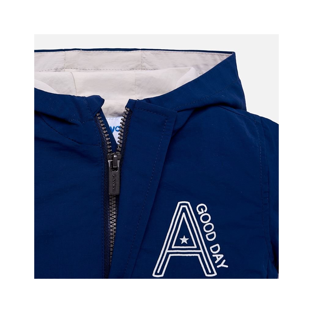 Chlapčenská vetrovka s dlhým rukávom s detailom v kontrastnej farbe pre chlapcov. Okrúhly výstrih s kontrastnými detailmi. Dizajn s kapucňou, ktorá je odnímateľná. Zapínanie na zips a gombíky. Vyrobené z ľahkej priedušnej látky, ktorá sa pohodlne nosí. Vrecká so zipsami. Dekoratívne prvky: dekoratívna nášivka.