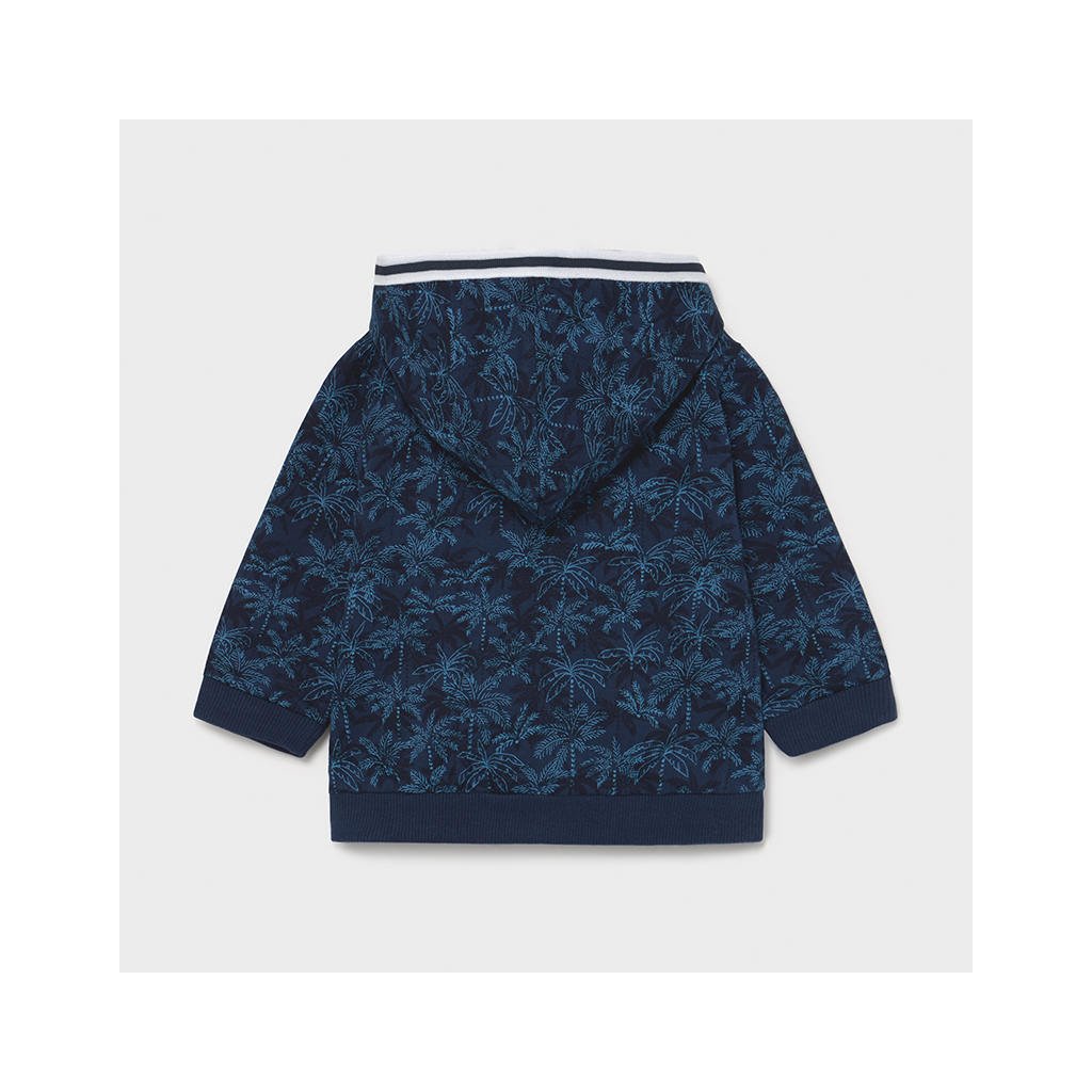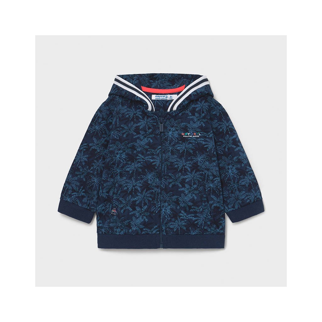 Mayoral chlapčenská mikina s kapucňou. Zapínanie na zips. Príjemný jemný materiál. Zdobená tropickou potlačou. Na konci rukávov sú elastické manžety.