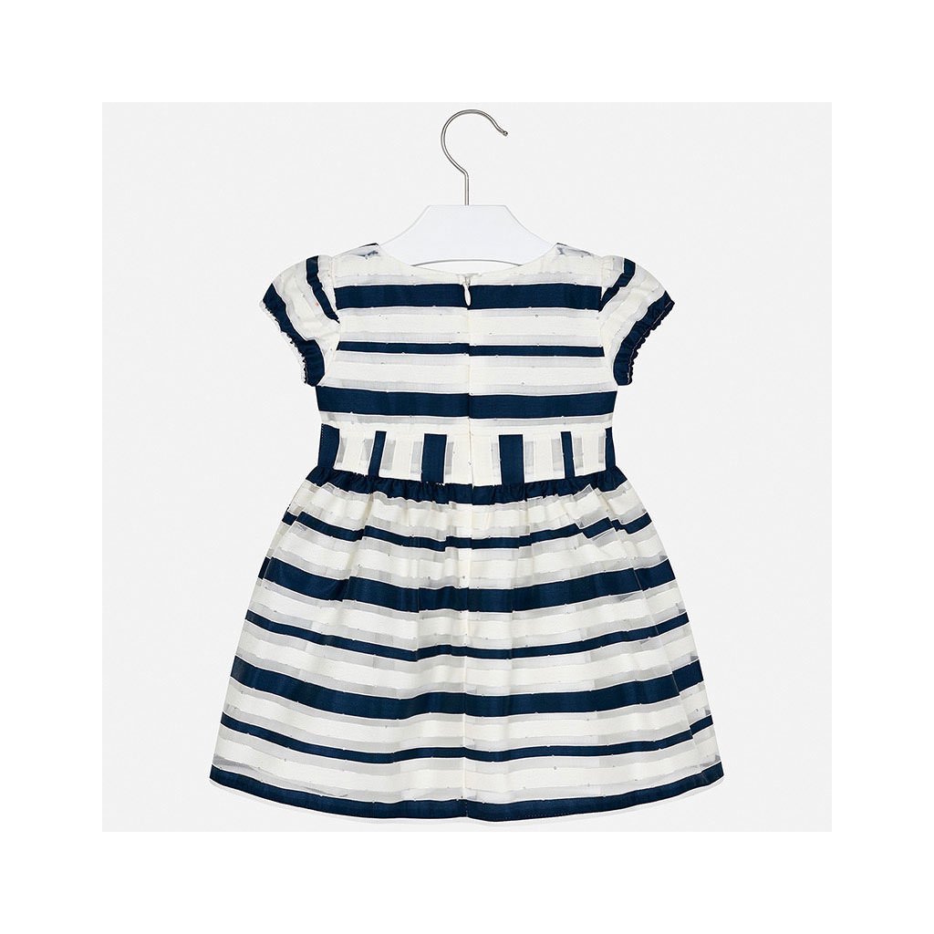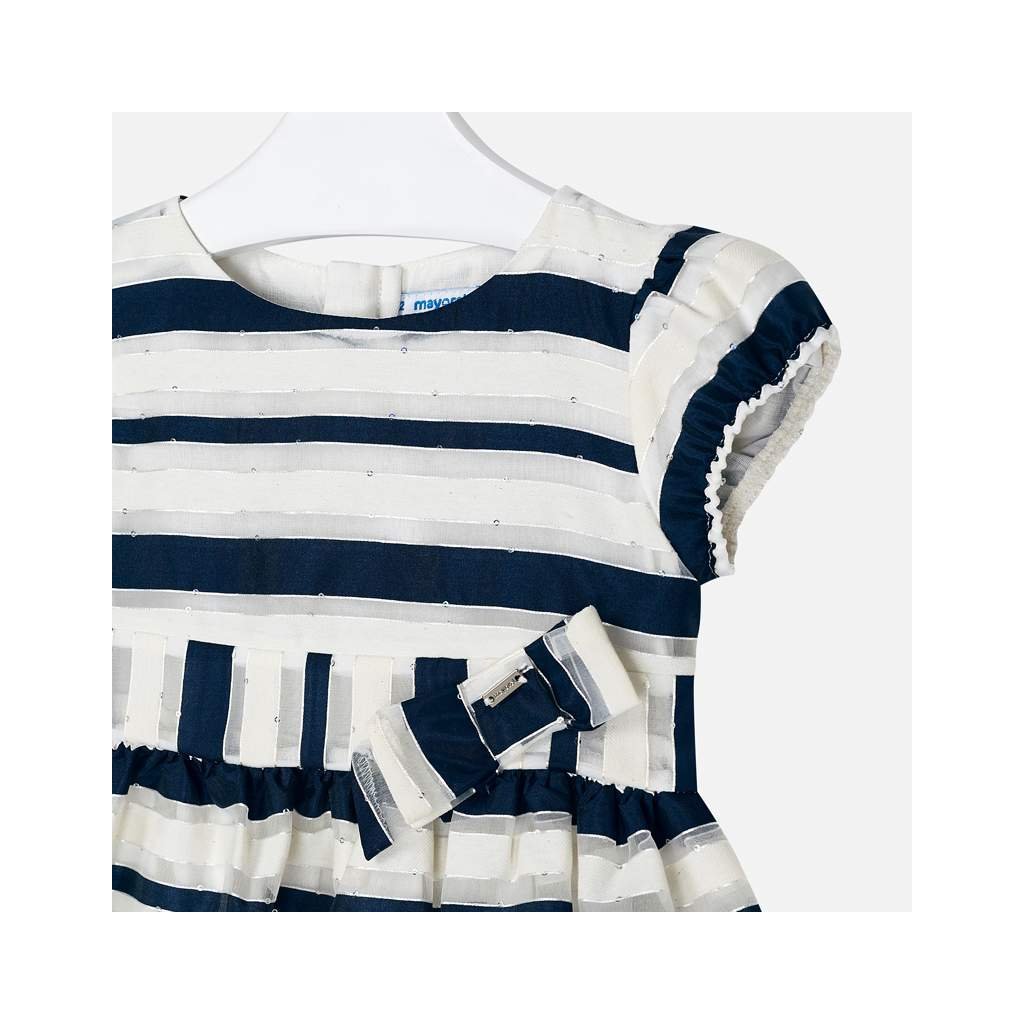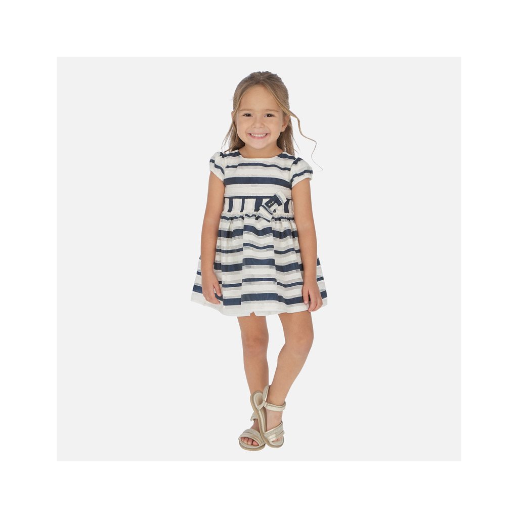 Krátke rukávy pre dievčatá. Okrúhly výstrih. Zapínanie na chrbte na skrytý zips. Vyrobené z elastickej látky pre maximálne pohodlie každý deň. Zvolnený dizajn. Dekoratívne prvky: ozdobný luk. Pruhatý vzor.