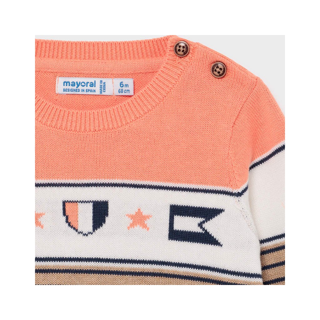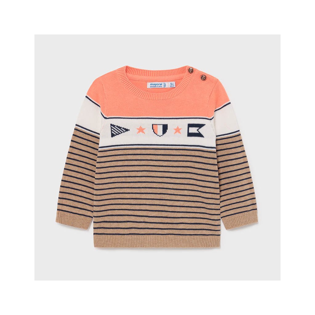 Mayoral chlapčenský pruhovaný sveter. Vyrobený z čistej bavlnenej jemnej pleteniny. Okrúhly výstrih. Zapínanie pri krku na gombíky.