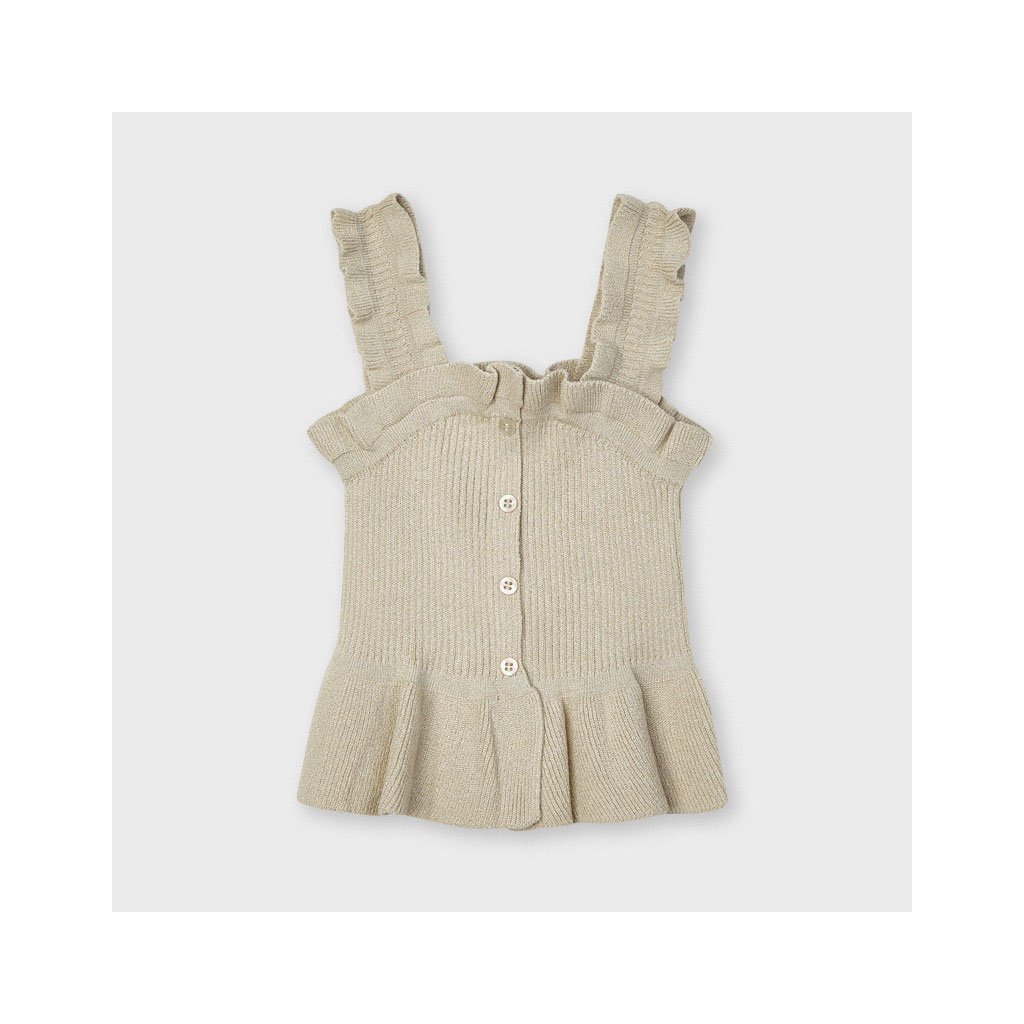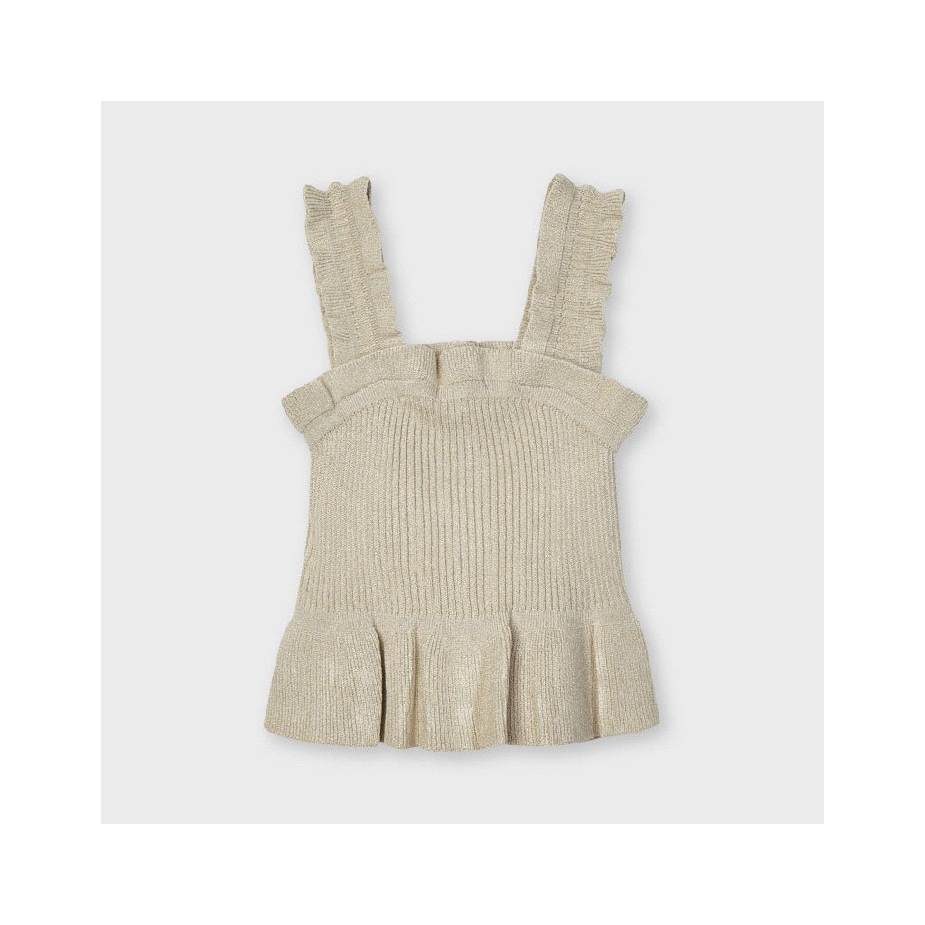 Mayoral dievčenský top na ramienka. Vyrobený z veľmi jemného hebkého Ecofriends materiálu - ECOVERO (udržateľná viskóza), pružný, krásne prilne k telu. Široké ramienka, zapínanie vpredu pomocou gombíkov. Vzor s vrúbkovaním. Zdobený volánikmi.