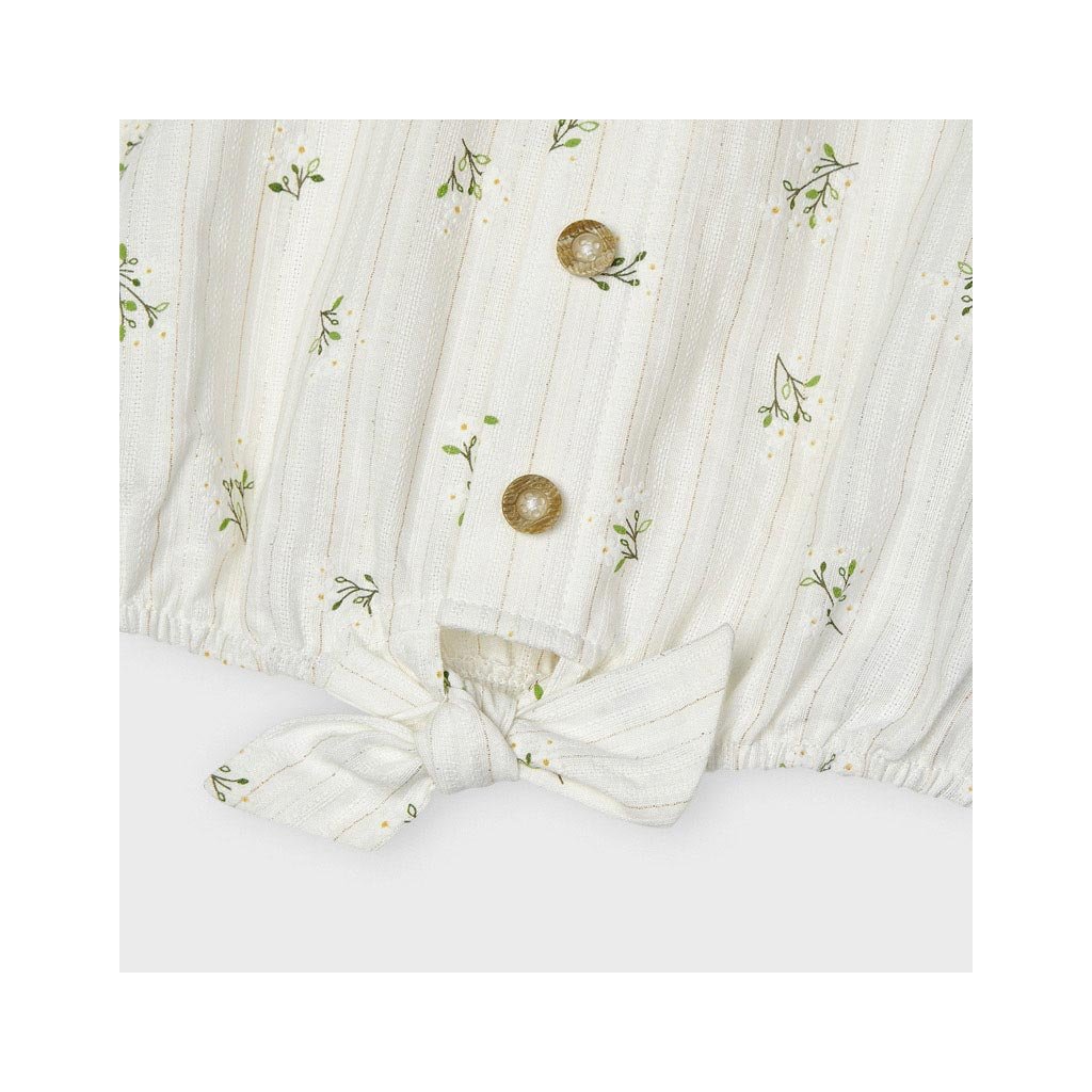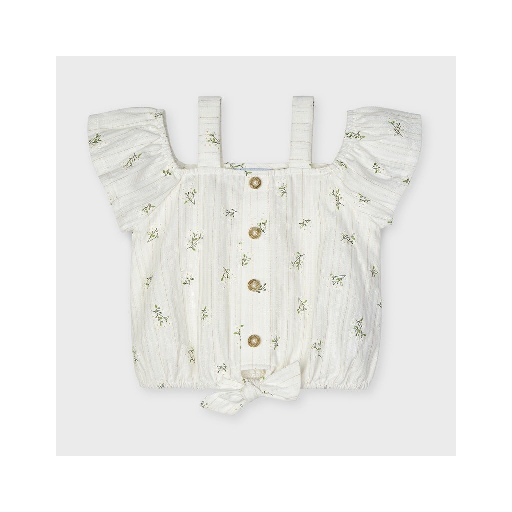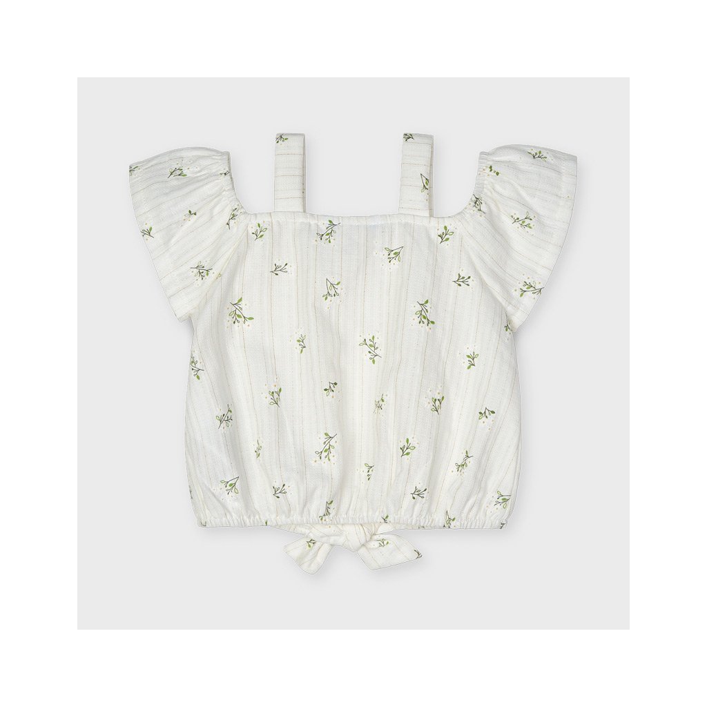 Mayoral dievčenské tielko. Vyrobený z jemného bavlneného materiálu. Ozdobné gombíky v prednej časti, dvojité ramienka, v spodnej časti sa dá uviazať mašlička. Jemná potlač kvietkov.