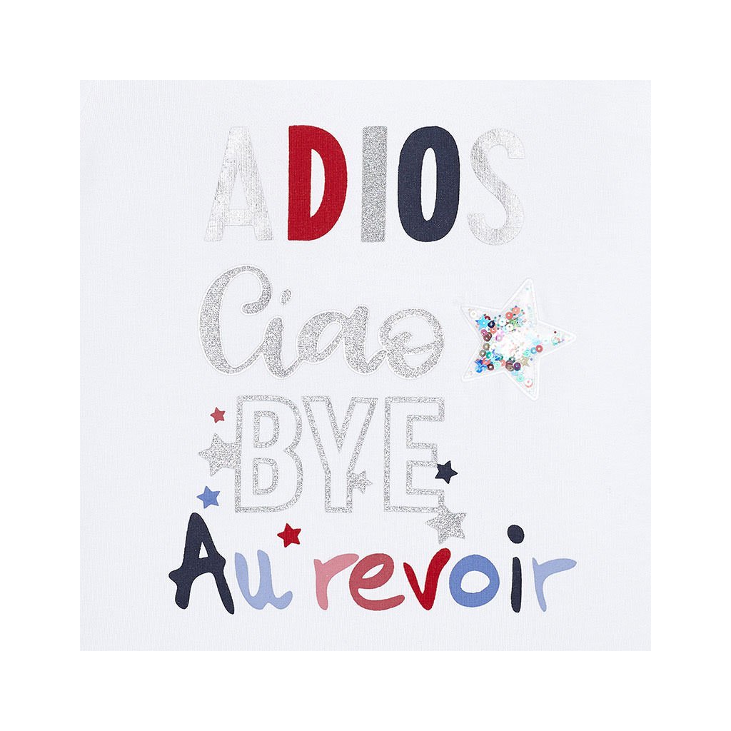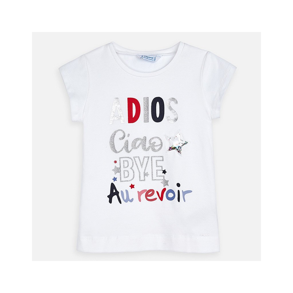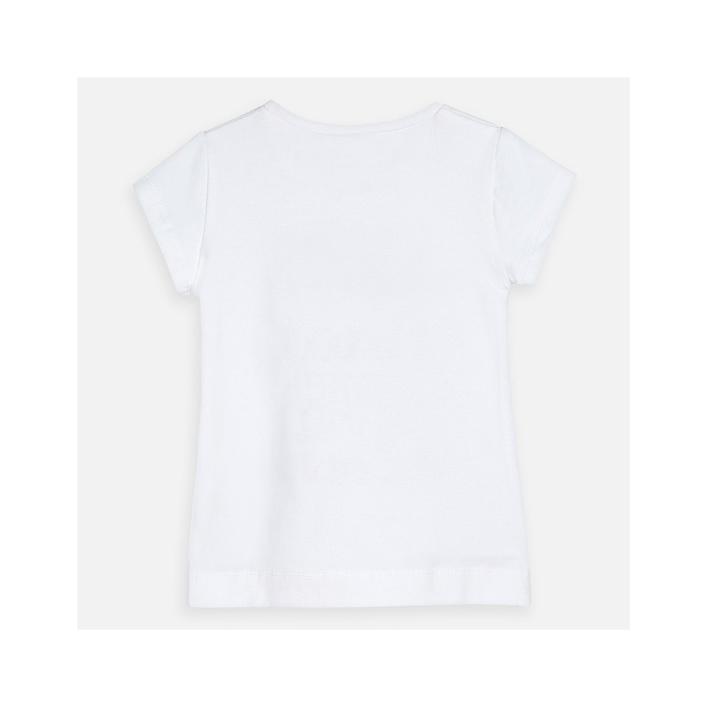 Tričko s krátkym rukávom pre dievča. Okrúhly výstrih. Vyrobené z mäkkej elastickej bavlnenej tkaniny. Dekoratívne prvky: dizajn vpredu, trblietky, flitre. Z bezpečnostných dôvodov môžu mať menšie veľkosti (2-3 roky) niektoré varianty dekoratívnych prvkov použitých v návrhu.