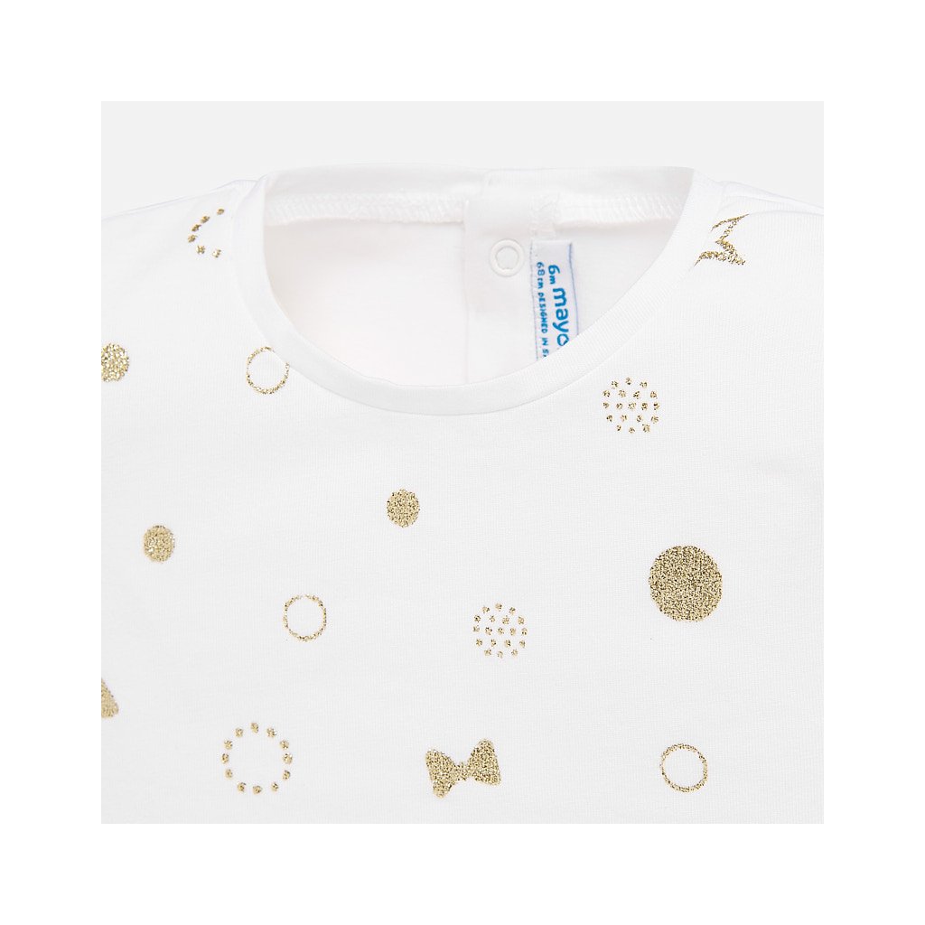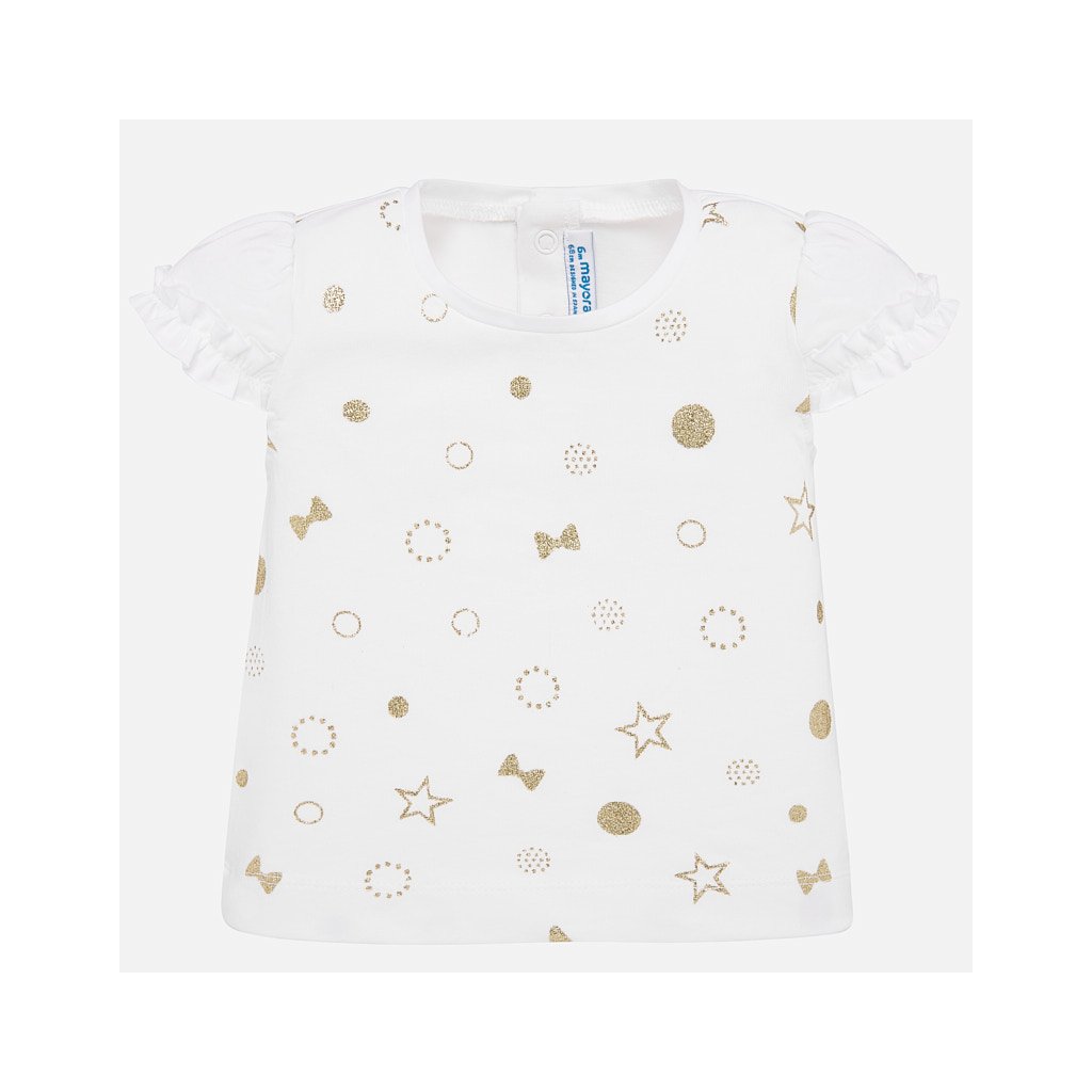 Tričko s krátkym rukávom pre dievčatko. Okrúhly výstrih. Zapínací gombík na zadnej strane umožňuje ľahké obliekanie odevov. Vyrobené z mäkkej elastickej bavlnenej tkaniny. Dekoratívne prvky: dizajn vpredu, trblietky.