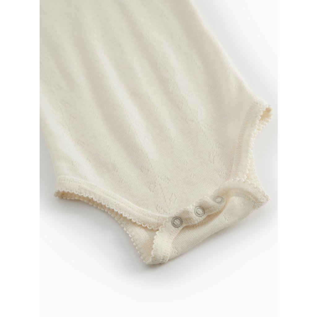 Tento krásný body od značky MarMar Copenhagen je vyroben z jemné směsi merino vlny a viskózy, která je mimořádně hebká, prodyšná a příjemná k citlivé dětské pokožce. Jemný žakárový pointelle vzor dodává body elegantní vzhled a zároveň zajišťuje lehkost a pružnost materiálu.